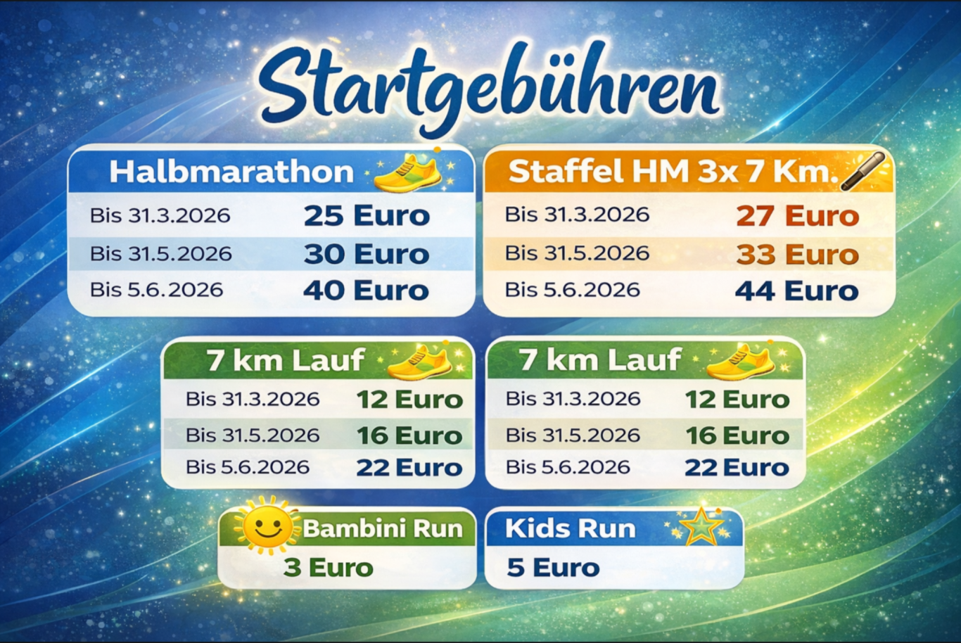 Die Anmeldung erfolgt vorab und sichert dir deinen Platz. Nachmeldungen vor Ort sind nicht möglich. Für den Halbmarathon gilt ein Limit von 500 Teilnehmern, für den 7 km-Lauf 200 Teilnehmer und für die Kids Runs jeweils 100 Teilnehmer pro Altersklasse. Staffel-Teams beim Halbmarathon sind auf 100 begrenzt.