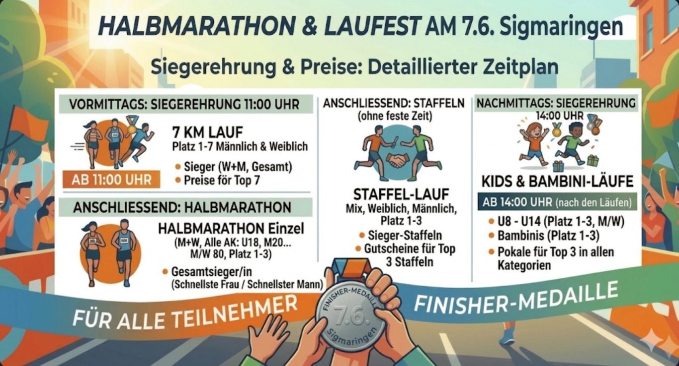 • Medaillen: Jede Teilnehmerin und jeder Teilnehmer (Erwachsene, Kids & Bambini) erhält direkt im Zieleinlauf die exklusive Finisher-Medaille.