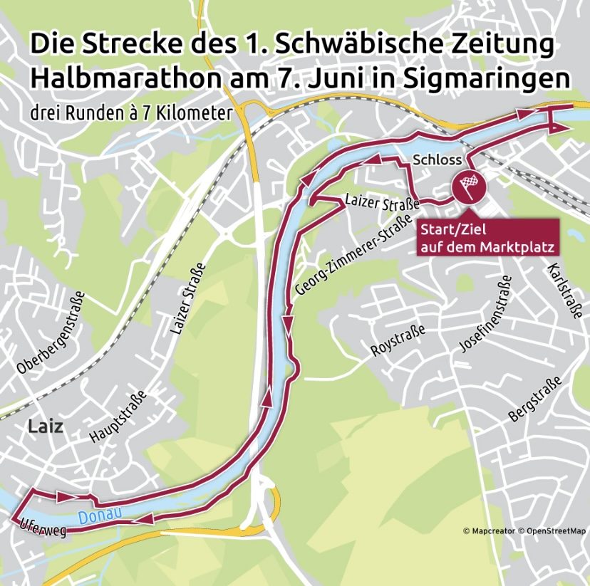Die Halbmarathon-Strecke misst 21,1 km und wird auf einem etwa 7 km langen Rundkurs gelaufen, der dreimal zu absolvieren ist. Zunächst führt die Route durch die Burgstraße, dann über den Radweg Richtung Laiz. Ein kleiner Schlenker über den Festplatz bringt die volle Distanz der Runde zusammen. Über die Donau hinweg geht es entlang eines Schotterwegs vorbei an Karls Hotel und über die Nepomukbrücke zurück in Richtung Innenstadt. Unterhalb des Sigmaringer Schlosses läuft die Strecke wieder auf den Marktplatz – dein Start- und Zielpunkt.